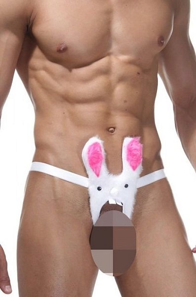 Мужские трусы-танга, из кружевного полотна белого цвета. Танга завязываются по бокам на тонких черных веревках с двух сторон.
