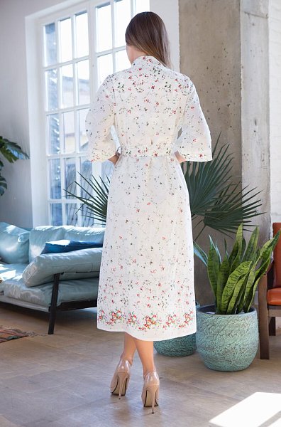 Халат домашний женский выполнен из нежного принтованного хлопка. Модель свободного силуэта длиной на середину голени. Воротник шалька, рукав прямой длиной 3/4. Халат завязывается на пояс и внутреннюю завязку. Модель с накладными карманами впереди.