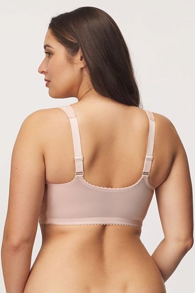 Бюстгальтер Rachela - уникальная модель с застежкой из 7 скрытых крючков спереди. Чашки мягкие, без косточек, шитые из эластичной прочной ткани и кружева, с внутренней стороны пришита сетка, предотвращающая вытягивание ткани чашки. Внутренняя сторона чашек обшита нежной тканью, придающей форму бюстгальтеру. Широкие бретели регулируются по длине, покрыты корсетной пеной, что обеспечивает невероятный комфорт, бретели держат спину в правильном положении, резинка под грудью надёжно поддерживает, фурнитура металлическая крашеная. Спинка из корректирующей сетки, окружность нельзя регулировать. Бюстгальтер Rachela - по-настоящему удобный бескаркасный бюстгальтер на каждый день.