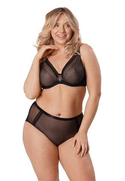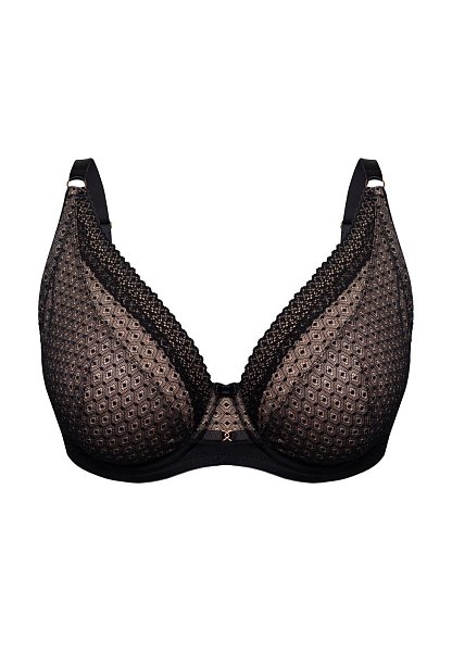 Бюстгальтер Renee M бралетт выполнен на косточках, чашки мягкие, шитые из сетки с геометрическим рисунком, продублированы телесной сеткой. Пояс из микрофибры продублирован сеткой. Бретельки пришиты, регулируются по длине. На спине застёжка на удлинитель, фурнитура металлическая цвета меди.