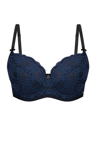 Бюстгальтер Debora PU выполнен на косточках, с дополнительными боковыми поддержками, чашки шитые, нижняя часть чашки на тонком поролоне черного цвета, внутренняя сторона проложена хлопковым трикотажем, внешняя и верхняя часть чашки из кружева темно-синего цвета, спинка кружевная, продублирована черной сеткой. Бретельки пришиты, регулируются по длине. На спине застёжка на удлинитель, фурнитура металлическая цвета желтого золота.