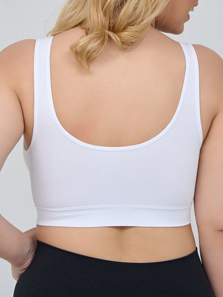 Гладкий бюстгальтер-топ, с подкроем для комфортного удержания груди, широкие бретели, формованные вставки вынимаются, очень комфортный, микрофибра, V-образный вырез делает фигуру зрительно стройнее.