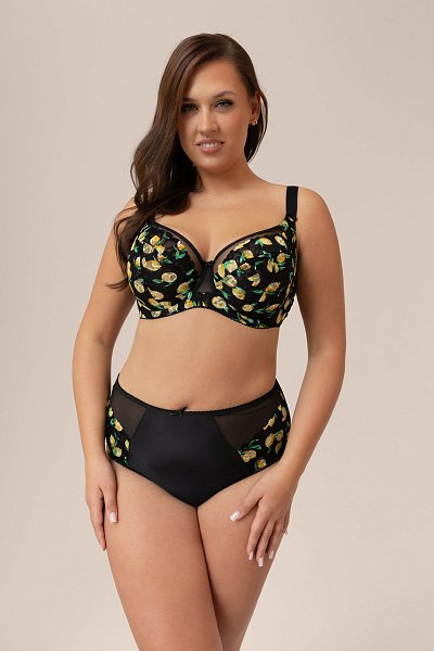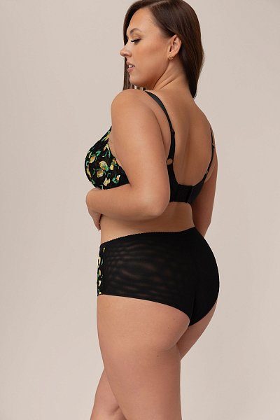 Женские трусики-бразилиана спереди выполнены из микрофибры, по бокам вставки из гипюра с принтом в виде лимончиков, продублированы черной сеткой, спинка из сетки, сложенной вдвое, ластовица проложена 100% хлопком. Идеальный вариант для повседневной носки.