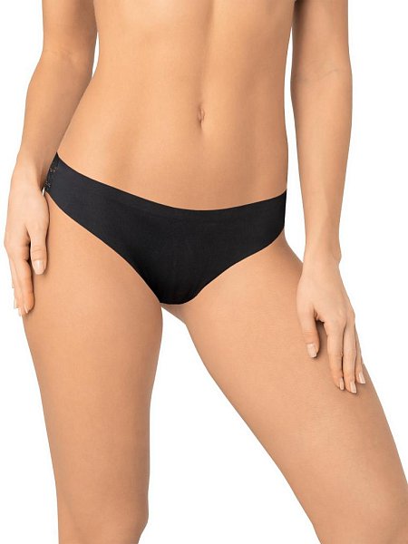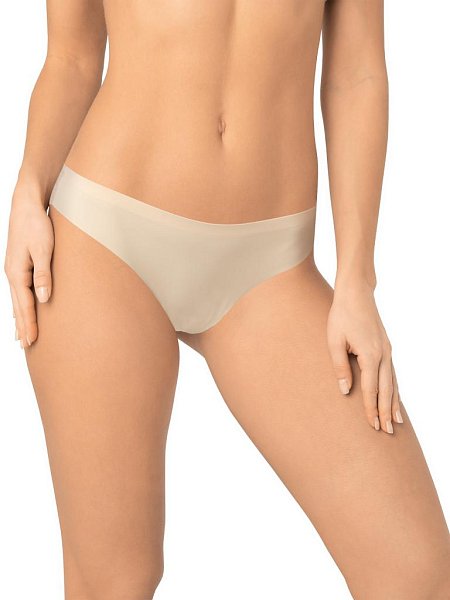 Трусы-бразилиана со средней линией талии. Передняя деталь выполнена из мягкой микрофибры, задняя деталь - из тончайшего плоского кружева. Спереди вырез ножки обработан с использованием технологии лазерного края. Спереди линия талии проклеена вподгибку, сзади по талии пришита деликатная эластичная тесьма. Хлопковая ластовица притачана к изделию потайным швом. Благодаря особенностям обработки материалов изделие абсолютно незаметно под одеждой.
