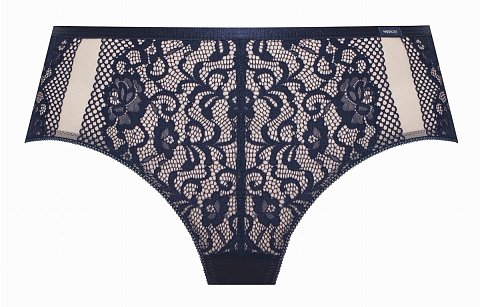 Трусики-шорты спереди из кружевного полотна, продублированного эластичной телесной сеткой, спинка из сетки, сложенной вдвое. Ластовица проложена 100% хлопком.